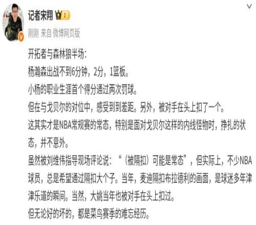 雷速体育10月23报道 今日NBA常规赛,开拓者对阵森林狼,杨瀚森迎来常规赛首秀,对他的表现,记者宋翔发文表示,杨瀚森在与戈贝尔的对位中感受到差距,这才是NBA常规赛的常态。