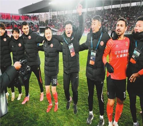中甲夺冠时刻,李金羽(右四)激情庆祝。 辽宁日报记者 孙海涛 摄